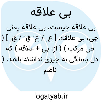 بی علاقه. [ ع ِ / ع َ ق َ / ق ِ ] ( ص مرکب ) ( از: بی + علاقه ) که دل بستگی به چیزی نداشته باشد. ( ناظم الاطباء ). بی مهر. بی میل. || مرد مجرد. بی زن و خانمان. ( ناظم الاطباء ). و رجوع به علاقه شود.