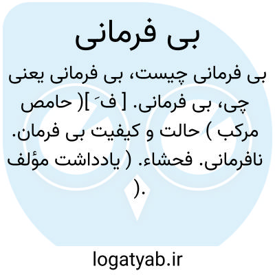 بی فرمانی. [ ف َ ]( حامص مرکب ) حالت و کیفیت بی فرمان. نافرمانی. فحشاء. ( یادداشت مؤلف ). عصیان. تمرد. سرکشی: