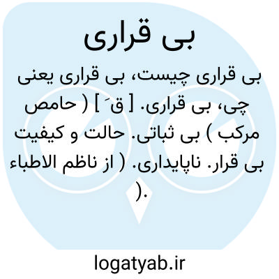 بی قراری. [ ق َ ] ( حامص مرکب ) بی ثباتی. حالت و کیفیت بی قرار. ناپایداری. ( از ناظم الاطباء ). مقابل ثبات و سکون. || بی آرامی و قَلَق و وحشت و اضطراب. ( ناظم الاطباء ). تململ. برم. تبعص. تبعصص. ضجر. بی طاقتی. بی تابی. ( یادداشت مؤلف ) ( از منتهی الارب ): جواظ، ضجر، اجنثان؛ بی خوابی و بی قراری. ( منتهی الارب ). ناشکیبایی. بی صبری: پس اگر بی قراری و حرارت بر حال خویش باشد یا زیادت می شودبباید دانست که ماده قویست. ( ذخیره خوارزمشاهی ).