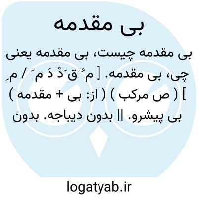 بی مقدمه. [ م ُ ق َدْ دَ م َ / م ِ ] ( ص مرکب ) ( از: بی + مقدمه ) بی پیشرو. || بدون دیباجه. بدون پیش درآمد. ابتدابه ساکن. || بدون سابقه.