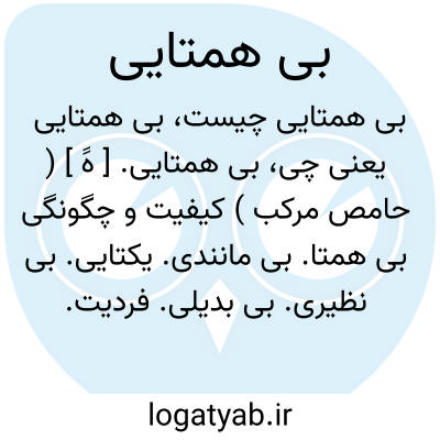 بی همتایی. [ هََ ] ( حامص مرکب ) کیفیت و چگونگی بی همتا. بی مانندی. یکتایی. بی نظیری. بی بدیلی. فردیت. عزت. بی مثلی. بی شریکی.