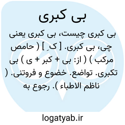 بی کبری. [ ک ِ ] ( حامص مرکب ) ( از: بی + کبر + ی ) بی تکبری. تواضع. خضوع و فروتنی. ( ناظم الاطباء ). رجوع به کبر شود.