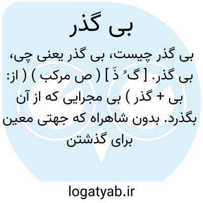 بی گذر. [ گ ُ ذَ ] ( ص مرکب ) ( از: بی + گذر ) بی مجرایی که از آن بگذرد. بدون شاهراه که جهتی معین برای گذشتن ندارد. || بی گذار. بی گدار: