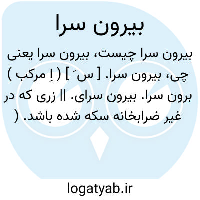 بیرون سرا. [ س َ ] ( اِ مرکب ) برون سرا. بیرون سرای. || زری که در غیر ضرابخانه سکه شده باشد. ( از برهان ) ( از جهانگیری )( از رشیدی ) ( از انجمن آرا ) ( از ناظم الاطباء ). آن رابیرونی نیز گویند. ( آنندراج ). برون سرا: