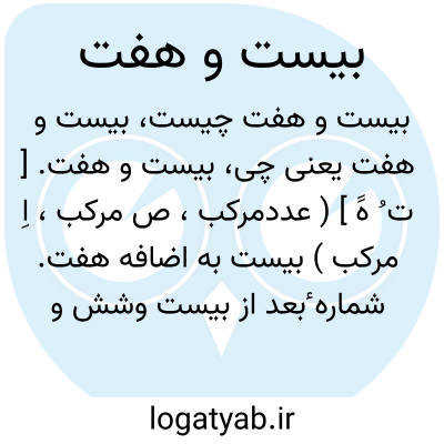 بیست و هفت. [ ت ُ هََ ] ( عددمرکب، ص مرکب، اِ مرکب ) بیست به اضافه هفت. شماره ٔبعد از بیست وشش و قبل از بیست وهشت. سبعة و عشرون.