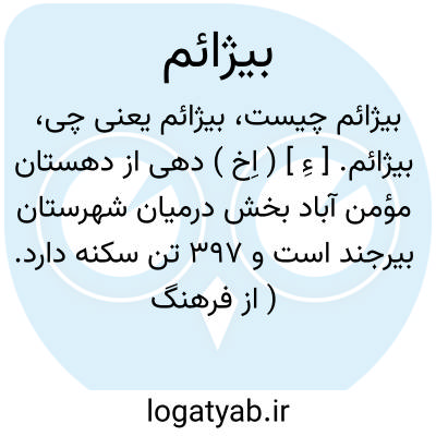 بیژائم. [ ءِ ] ( اِخ ) دهی از دهستان مؤمن آباد بخش درمیان شهرستان بیرجند است و 397 تن سکنه دارد. ( از فرهنگ جغرافیایی ایران ج 9 ).