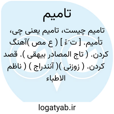 تأمیم. [ ت َءْ ] ( ع مص )آهنگ کردن. ( تاج المصادر بیهقی ). قصد کردن. ( زوزنی )( آنندراج ) ( ناظم الاطباء ). || ( در اصطلاح امروز عرب ) ملی کردن: تأمیم البترل؛ ملی کردن نفت.