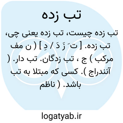 تب زده. [ ت َ زَ دَ / دِ ] ( ن مف مرکب ) ج، تب زدگان. تب دار. ( آنندراج ). کسی که مبتلا به تب باشد. ( ناظم الاطباء ). نزیف. موعوک. مورود. ( منتهی الارب ):