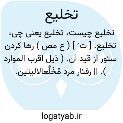 تخلیع. [ ت َ ] ( ع مص ) رها کردن ستور از قید آن. ( ذیل اقرب الموارد ). || رفتار مرد مُخَلَّعالالیتین. ( منتهی الارب ) ( آنندراج ). رفتار مرد مُخَلَّعالالیتین یعنی آنکه هر دو سرینش از هم جدا بود. ( ناظم الاطباء ). || تفکیک. ( اقرب الموارد ) ( المنجد ). || نوعی از تصرفات عروض است. ( منتهی الارب ) ( آنندراج ) ( ناظم الاطباء ).... چون خَبْن و قَطْع در مستفعلن جمع شود مُفْتَعِل ُ بماند، فعولن بجای آن بنهند، و این زحاف را تخلیع خوانند و فعولن چون از مستفعلن خیزد آنرا مخلع خوانند یعنی دست بریده. ( المعجم چ قزوینی و مدرس رضوی ص 40 ).
