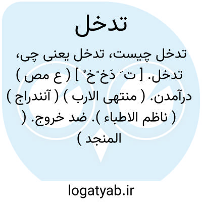 تدخل. [ ت َ دَخ ْخ ُ ] ( ع مص ) درآمدن. ( منتهی الارب ) ( آنندراج ) ( ناظم الاطباء ). ضد خروج. ( المنجد ) ( اقرب الموارد ). || اندرآمدن اندک اندک. ( تاج المصادر بیهقی ). اندک اندک درآمدن. ( منتهی الارب ) ( آنندراج ) ( ناظم الاطباء ). داخل شدن چیزی اندک اندک. ( المنجد ) ( اقرب الموارد ).