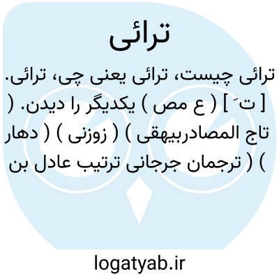 ترائی. [ ت َ ] ( ع مص ) یکدیگر را دیدن. ( تاج المصادربیهقی ) ( زوزنی ) ( دهار ) ( ترجمان جرجانی ترتیب عادل بن علی ) ( آنندراج ). دیدن بعض آنها مر بعض را، کذا تراءالجمعان؛ یعنی دچار شدند آن دو جمعیت بهم. ( از منتهی الارب ) ( ناظم الاطباء ). دیدن بعض قوم بعض دیگر را. ( اقرب الموارد ) ( از المنجد ). || خود را در آیینه دیدن. ( منتهی الارب ) ( از آنندراج ) ( از ناظم الاطباء ) ( اقرب الموارد ) ( المنجد ). || نمودار شدن چیزی و پیش آمدن کسی را از پریان. ( منتهی الارب ) ( ناظم الاطباء ). || خود را نمایاندن بکسی. ( المنجد ): و لما ترأت عند مرو منیتی؛ یعنی هنگامی که درنزدیک مرو مرگ خود را بمن نمایاند. ( از اقرب الموارد ). نمودار شدن چیزی. ( آنندراج ): ترائی لی؛ ظاهر شد تا که دیدم یا پیش آمد ببینم او را. || سرخ و زرد شدن غوره خرما. ( منتهی الارب ) ( ناظم الاطباء ). ظاهر شدن رنگهای غوره خرما. ( اقرب الموارد ). || نگریستن در کار. ( منتهی الارب ) ( ناظم الاطباء ) ( اقرب الموارد ) ( المنجد ). || در برابر یکدیگر افتادن. ( تاج المصادر بیهقی ) ( زوزنی ): داراهما چتتراءَیان؛ ای تتقابلان. ( اقرب الموارد ). فی الحدیث: لاترائی ناراهما؛ یعنی لازم است مسلم را که همسایگی نکند با مشرک و خانه خود را از خانه مشرک دور دارد بحدی که اگر برافروزد آتش را نبیند آنرا آتش مشرک، و اصل آن تترأی ̍ است و یکی از دو «ت » برای تخفیف حذف شده است. ( از منتهی الارب ). || مایل شدن به رأی کسی و اقتدا بدو کردن. ( المنجد ). || نمودار و ظاهر شدن کیفیت کار: ترأی ̍ لی ان الامر کیت و کیت؛ ای ظهر لی. ( المنجد ). || بزحمت هلال را نگریستن که دیده می شود یا نه. ( المنجد ).