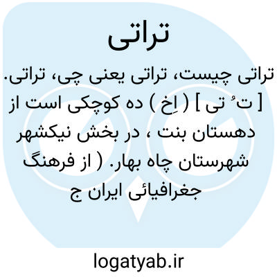 تراتی. [ ت ُ تی ] ( اِخ ) ده کوچکی است از دهستان بنت، در بخش نیکشهر شهرستان چاه بهار. ( از فرهنگ جغرافیائی ایران ج 8 ).