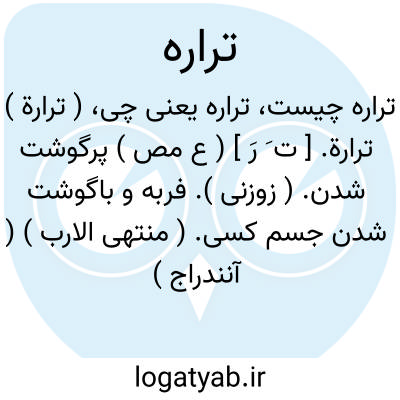 ( ترارة ) ترارة. [ ت َ رَ ] ( ع مص ) پرگوشت شدن. ( زوزنی ). فربه و باگوشت شدن جسم کسی. ( منتهی الارب ) ( آنندراج ) ( از اقرب الموارد ) ( از المنجد ): فی بدنه ترارة؛ ای سمن و بضاضة و امتلاء. ( اقرب الموارد ). تارّ نعت است از آن. ( آنندراج ). ترتراً و تروراً و ترارةً. ( ناظم الاطباء ). رجوع به تارّ شود.