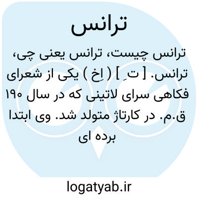 ترانس. [ ت ِ ] ( اِخ ) یکی از شعرای فکاهی سرای لاتینی که در سال 190 ق.م. در کارتاژ متولد شد. وی ابتدا برده ای بیش نبود و سپس آزاد گشت. او هم مانندپلوت از نویسندگان یونان، خصوصاً از مناندر پیروی میکرد. شش اثر کمدی که از وی باقی مانده عبارتند از: لاندرین، لونوک، لسیر،لوتونتی مورومنوس، لو فورمیون، لزادلف. در این نمایشنامه ها آثار مضحکه و استهزاء بمراتب کمتر از نمایشنامه های پلوت است. داستانهای ترانس بسیار معتدل ولی بعلت تصویرهای زیبا و ظریفی که از شخصیت های داستان بدست میدهد، آنها را ارزنده و جالب ساخته است. بطور کلی آثار این شاعر قصه پرداز، محتوی ادب و نزاکت و علاقه شدیدی به اخلاق است.