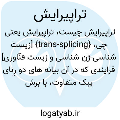 {trans-splicing} [زیست شناسی-ژن شناسی و زیست فنّاوری] فرایندی که در آن بیانه های دو رِنای پیک متفاوت، با برش و دوخت به یکدیگر، در تشکیل یک رنای رسیده شرکت می کنند متـ. ترا رِناپیرایش trans-RNA splicing تراپیرایش پیش رِناپ pre-mRNA trans-splicing