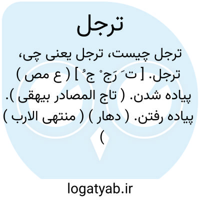 ترجل. [ ت َ رَج ْ ج ُ ] ( ع مص ) پیاده شدن. ( تاج المصادر بیهقی ). پیاده رفتن. ( دهار ) ( منتهی الارب ) ( آنندراج ) ( ناظم الاطباء ). پیاده شدن از ستور و پیاده رفتن. ( از اقرب الموارد ) ( از المنجد ). || روز بفراخ چاشتگاه رسیدن. ( تاج المصادربیهقی ). برآمدن و بلند شدن روز. ( منتهی الارب ) ( آنندراج ) ( ناظم الاطباء ). بلند شدن روز و خورشید. ( از منتهی الارب ). بلند شدن خورشید. ( از المنجد ): و هاج به لما ترجلت الضحی. ( اقرب الموارد ). || سوده پاگردیدن از پیاده رفتن. ( منتهی الارب ) ( آنندراج ) ( ناظم الاطباء ). || بند دست در زیر هر دو پا گذاشتن. ( منتهی الارب ) ( ناظم الاطباء ) ( از اقرب الموارد )( از المنجد ). || در چاه فرودآمدن. ( منتهی الارب ) ( آنندراج ) ( ناظم الاطباء ) ( از المنجد ). کذا ترجل فی البئر. ( منتهی الارب ) ( ناظم الاطباء ). فرودآمدن در چاه بی آنکه آویزان کرده شود. ( از اقرب الموارد ) ( از المنجد ). || همچو مرد گردیدن زن. ( منتهی الارب ) ( آنندراج ) ( ناظم الاطباء ) ( از اقرب الموارد ) ( از المنجد ). || موی بشانه کردن. ( تاج المصادر بیهقی ) ( منتهی الارب ) ( آنندراج ) ( ناظم الاطباء ).