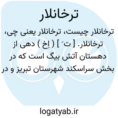 ترخانلار. [ ت َ ] ( اِخ ) دهی از دهستان آتش بیگ است که در بخش سراسکند شهرستان تبریز و در 30هزارگزی جنوب باختری سراسکند و 18هزارگزی شوسه سراسکند به سیاه چمن و 15هزارگزی راه آهن میانه به مراغه قرار دارد. کوهستانی و معتدل است و 303 تن سکنه دارد. آب آن از چشمه و محصول آن غلات و حبوبات و شغل اهالی زراعت و گله داری است.راه مالرو دارد. ( از فرهنگ جغرافیائی ایران ج 4 ).