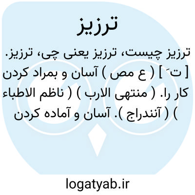 ترزیز. [ ت َ ] ( ع مص ) آسان و بمراد کردن کار را. ( منتهی الارب ) ( ناظم الاطباء ) ( آنندراج ). آسان و آماده کردن کار را. ( از اقرب الموارد )( از المنجد ): رززت ذلک الامر ترزیزاً؛ اذا وطأته و مهدته. ( منتهی الارب ) ( ناظم الاطباء ). || آهار دادن و مهره زدن کاغذ. ( تاج المصادر بیهقی ). مهره و آهار کردن کاغذ را. ( منتهی الارب ) ( ناظم الاطباء ). صیقل کردن کاغذ را. ( از اقرب الموارد ) ( از المنجد ). بر کاغذ مهره کردن و چیزی را صیقل زدن. ( آنندراج ).