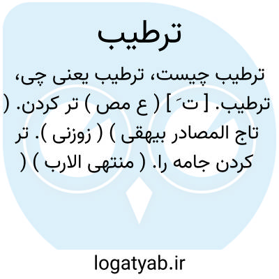 ترطیب. [ ت َ ] ( ع مص ) تر کردن. ( تاج المصادر بیهقی ) ( زوزنی ). تر کردن جامه را. ( منتهی الارب ) ( ناظم الاطباء ). تر کردن و تری در مزاج آوردن.( غیاث اللغات ) ( از آنندراج ). و من المجاز: و ما رطب لسانی بذکرک الا ما بللتنی به من برک. ( اقرب الموارد ). || رُطَب دادن. ( تاج المصادر بیهقی ). رطب خورانیدن قوم را. ( منتهی الارب ) ( ناظم الاطباء ) ( آنندراج ) ( از اقرب الموارد ) ( از المنجد ). || رطب گردیدن بُسر. ( از اقرب الموارد ) ( از المنجد ).