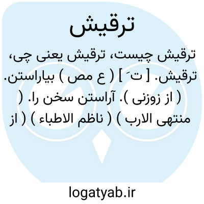 ترقیش. [ ت َ ] ( ع مص ) بیاراستن. ( از زوزنی ). آراستن سخن را. ( منتهی الارب ) ( ناظم الاطباء ) ( از اقرب الموارد ) ( از المنجد ). || سخن چینی کردن. ( زوزنی ). بربستن و سخن چینی کردن. ( منتهی الارب ) ( ناظم الاطباء ). سخن چینی کردن، زیرا نمام کلام خود را آرایش دهد. ( از اقرب الموارد ) ( از المنجد ). || نوشتن سخن را. || نوشتن صحیفه را. || عتاب کردن کسی را. ( از اقرب الموارد ) ( از المنجد ).