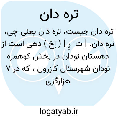 تره دان. [ ت َ رِ ] ( اِخ ) دهی است از دهستان نودان در بخش کوهمره نودان شهرستان کازرون، که در 7 هزارگزی شمال نودان، در دامنه شمالی کوه تل مرگ و رودخانه شاپور قرار دارد. دامنه و معتدل است و 105 تن سکنه دارد. آب آن از رودخانه شاپور و محصول آنجا غلات و برنج است. شغل مردم آنجا زراعت و قالی و گلیم بافی است. راه فرعی دارد. ( از فرهنگ جغرافیایی ایران ج 7 ).
