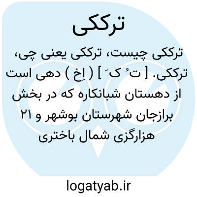 ترککی. [ ت ُ ک َ ] ( اِخ ) دهی است از دهستان شبانکاره که در بخش برازجان شهرستان بوشهر و 21 هزارگزی شمال باختری برازجان و 6 هزارگزی رودخانه شاپور قرار دارد. جلگه و گرمسیر است و 200 تن سکنه دارد. آب آن از چاه و محصول آنجا غله و تنباکو و صیفی و شغل اهالی زراعت است و راه فرعی دارد. ( از فرهنگ جغرافیایی ایران ج 7 ). قریه ای است دو فرسنگ و نیمی کمتر جنوب ده کهنه. ( فارسنامه ناصری ).