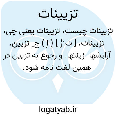 تزیینات. [ ت َزْ ] ( اِ ) ج ِ تزیین. آرایشها. زینتها. و رجوع به تزیین در همین لغت نامه شود.