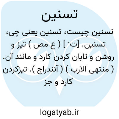 تسنین. [ت َ ] ( ع مص ) تیز و روشن و تابان کردن کارد و مانند آن. ( منتهی الارب ) ( آنندراج ). تیزکردن کارد و جز آن با سنگساب. ( از متن اللغة ). تیزکردن و صیقلی دادن کارد را. ( از اقرب الموارد ) ( از المنجد ). || آراستن و نیکوکردن سخن را. || راست کردن نیزه را به سوی کسی. ( منتهی الارب ) ( آنندراج ) ( ناظم الاطباء ) ( از متن اللغة ) ( از اقرب الموارد ) ( از المنجد ). || سنان گذاشتن نیزه را. ( از متن اللغة ) ( از المنجد ). || تسویک دندانها. ( از متن اللغة )( از المنجد ). || رستن دندانهای بدنه [ شتر یا گاو قربانی که بمکه فرستند ]. ( از متن اللغة ).