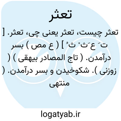 تعثر. [ ت َ ع َث ْ ث ُ ] ( ع مص ) بسر درآمدن. ( تاج المصادر بیهقی ) ( زوزنی ). شکوخیدن و بسر درآمدن. ( منتهی الارب ) ( آنندراج ) ( ناظم الاطباء ). لغزیدن و بسر درافتادن. ( از اقرب الموارد ). || شکوخیدن زبان در سخن. ( منتهی الارب )( آنندراج ) ( ناظم الاطباء ). تلعثم. ( اقرب الموارد ).