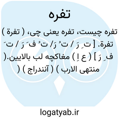 ( تفرة ) تفرة. [ ت ِ رَ / ت ُ رَ/ ت ُ ف َ رَ / ت َ ف ِ رَ ] ( ع اِ ) مغاکچه لب بالایین.( منتهی الارب ) ( آنندراج ) ( ناظم الاطباء ). نقره ای بر وسط لب بالا. ( از اقرب الموارد ). دایره ای که زیر بینی،در وسط لب زبرین است. ( یادداشت بخط مرحوم دهخدا ).
