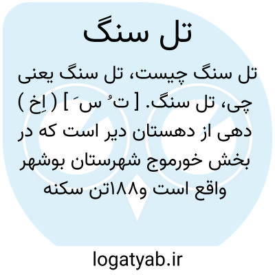 تل سنگ. [ ت ُ س َ ] ( اِخ ) دهی از دهستان دیر است که در بخش خورموج شهرستان بوشهر واقع است و188تن سکنه دارد. ( از فرهنگ جغرافیایی ایران ج 7 ).