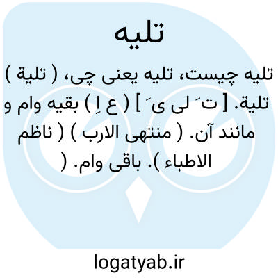 ( تلیة ) تلیة. [ ت َ لی ی َ ] ( ع اِ ) بقیه وام و مانند آن. ( منتهی الارب ) ( ناظم الاطباء ). باقی وام. ( مهذب الاسماء ).