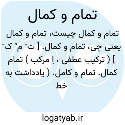 تمام و کمال. [ ت َ م ُ ک َ ] ( ترکیب عطفی، اِ مرکب ) تمام کمال. تمام و کامل. ( یادداشت به خط مرحوم دهخدا ): قرض خود را تمام و کمال پرداخت. ( یادداشت ایضاً ). رجوع به تمام و دیگر ترکیبهای آن شود.