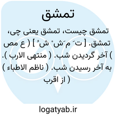 تمشق. [ ت َ م َش ْ ش ُ ] ( ع مص ) آخر گردیدن شب. ( منتهی الارب ). به آخر رسیدن شب. ( ناظم الاطباء ) ( از اقرب الموارد ). || آشکار شدن سفیدی صبح. ( منتهی الارب ) ( ناظم الاطباء )( از اقرب الموارد ). تمشق جلباب اللیل؛ ظهرت تباشیر الصبح. ( اقرب الموارد ). || پوست برکنده شدن شاخ و برهنه گردیدن آن. ( منتهی الارب ) ( ناظم الاطباء ) ( از اقرب الموارد ). || پاره شدن جامه. ( منتهی الارب ) ( ناظم الاطباء ). تمزق. ( اقرب الموارد ).