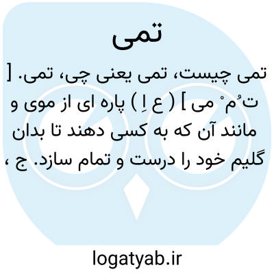 تمی. [ ت ُم ْ می ] ( ع اِ ) پاره ای از موی و مانند آن که به کسی دهند تا بدان گلیم خود را درست و تمام سازد. ج، تُمَم و تِمَم ( منتهی الارب ) ( ناظم الاطباء ). رجوع به تمم شود.