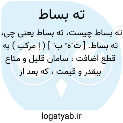 ته بساط. [ ت َه ْ ب َ ] ( اِ مرکب ) به قطع اضافت، سامان قلیل و متاع بیقدر و قیمت، که بعد از فروختن بماند. ( آنندراج ). بقیه از کالای دکان. توسعاً بقیه از هر چیزی. ( یادداشت بخط مرحوم دهخدا ). متاع باقیمانده پست و به فروش نرسیده. ( ناظم الاطباء ):