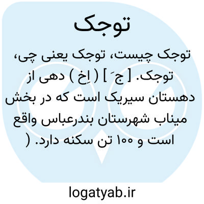 توجک. [ ج َ ] ( اِخ ) دهی از دهستان سیریک است که در بخش میناب شهرستان بندرعباس واقع است و 100 تن سکنه دارد. ( از فرهنگ جغرافیایی ایران ج 8 ).
