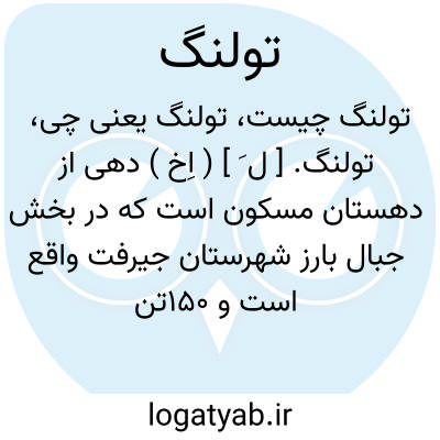 تولنگ. [ ل َ ] ( اِخ ) دهی از دهستان مسکون است که در بخش جبال بارز شهرستان جیرفت واقع است و 150تن سکنه دارد. ( از فرهنگ جغرافیایی ایران ج 8 ).