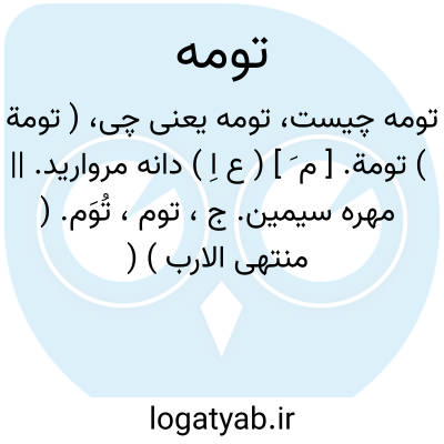 ( تومة ) تومة. [ م َ ] ( ع اِ ) دانه مروارید. || مهره سیمین. ج، توم، تُوَم. ( منتهی الارب ) ( آنندراج ) ( ناظم الاطباء ). دانه سیمین مانند مروارید.( از اقرب الموارد ). مهره سیمین. ( مهذب الاسماء ). رجوع به توم شود. || گوشواره ای که در آن دانه بزرگ باشد. ( منتهی الارب ) ( آنندراج ) ( ناظم الاطباء ). || بیضه شترمرغ. ( منتهی الارب ) ( آنندراج ) ( ناظم الاطباء ) ( از اقرب الموارد ). || ام تومة؛ صدف. ( منتهی الارب ) ( آنندراج ) ( ناظم الاطباء ).