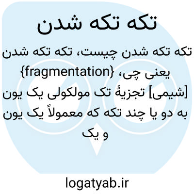 {fragmentation} [شیمی] تجزیۀ تک مولکولی یک یون به دو یا چند تکه که معمولاً یک یون و یک تکۀ خنثی می دهد