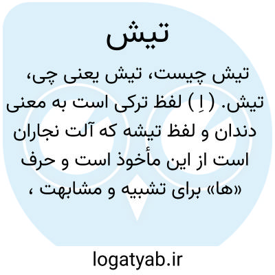 تیش. ( اِ ) لفظ ترکی است به معنی دندان و لفظ تیشه که آلت نجاران است از این مأخوذ است و حرف «ها» برای تشبیه و مشابهت، چنانکه در لفظ دندانه. ( غیاث اللغات ) ( آنندراج ).