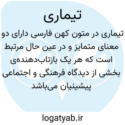 تیماری در متون کهن فارسی دارای دو معنای متمایز و در عین حال مرتبط است که هر یک بازتاب‌دهنده‌ی بخشی از دیدگاه فرهنگی و اجتماعی پیشینیان می‌باشد. در کاربرد ادبی و عاطفی، این واژه به حالتِ روانیِ گرفتگی، اندوه و غم‌زدگی اشاره دارد، در نقطه‌ی مقابلِ شادی و فرح. چنان‌که در منظومه‌ی ویس و رامین سروده شده است: «همه رنجی و تیماری سرآید / ز تخم صابری شادی برآید». این بیت بر این باور استوار است که از بذر شکیبایی، شادی می‌روید و دورانِ رنج و تیماری به سر می‌آید و نشان‌دهنده‌ی نگرشی امیدوارانه به چرخه‌ی طبیعتِ احوال انسانی است.