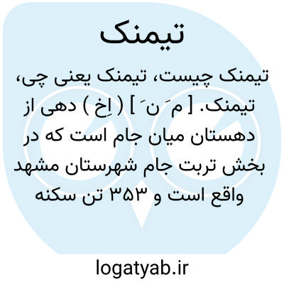 تیمنک. [ م َ ن َ ] ( اِخ ) دهی از دهستان میان جام است که در بخش تربت جام شهرستان مشهد واقع است و 353 تن سکنه دارد. ( از فرهنگ جغرافیایی ایران ج 9 ).