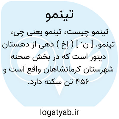 لغت نامه دهخدا تینمو. [ ن َ ] ( اِخ ) دهی از دهستان دینور است که در بخش صحنه شهرستان کرمانشاهان واقع است و 456 تن سکنه دارد. ( از فرهنگ جغرافیایی ایران ج 5 ).