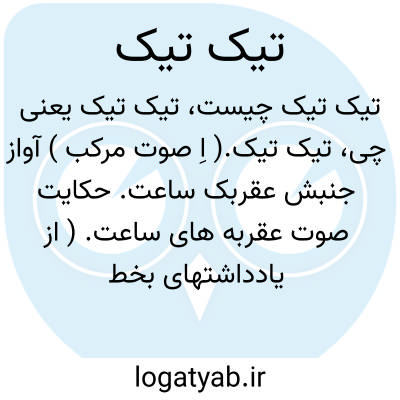 تیک تیک.( اِ صوت مرکب ) آواز جنبش عقربک ساعت. حکایت صوت عقربه های ساعت. ( از یادداشتهای بخط مرحوم دهخدا ). آواز حرکت یکنواخت رقاصک یا پاندول ساعت و جز آن. تک تک.