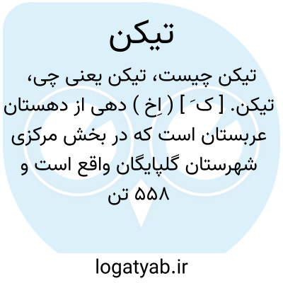 تیکن. [ ک َ ] ( اِخ ) دهی از دهستان عربستان است که در بخش مرکزی شهرستان گلپایگان واقع است و 558 تن سکنه دارد. ( از فرهنگ جغرافیایی ایران ج 6 ).