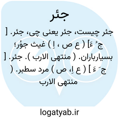 لغت نامه دهخدا جئر. [ ج ُ ءَ] ( ع ص، اِ ) غیث جؤر؛ بسیارباران. ( منتهی الارب ).جئر. [ ج َ ءَ ] ( ع اِ، ص ) مرد سطبر. ( منتهی الارب ).جئر. [ ج َ ءَ ] ( ع مص ) اندوهگین و گرفته خاطر شدن. ( از منتهی الارب ) ( از شرح قاموس ).