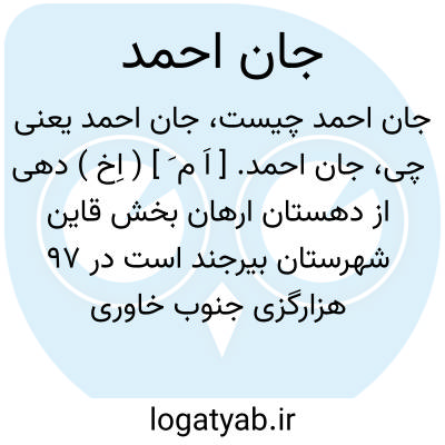 جان احمد. [ اَ م َ ] ( اِخ ) دهی از دهستان ارهان بخش قاین شهرستان بیرجند است در 97 هزارگزی جنوب خاوری قاین، سرراه اتومبیل رو اسفدان به اسفج واقع شده و محلی است معتدل که در دامنه قرار دارد و سکنه آن 257 تن است.زبان آنان فارسی و آب آن از قنات است. محصول آنجا غلات، شلغم، چغندر و شغل مردم زراعت و مالداری و راه آن اتومبیل رو می باشد. ( فرهنگ جغرافیایی ایران ج 9 ).