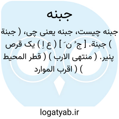 ( جبنة ) جبنة. [ ج ُ ن َ ] ( ع اِ ) یک قرص پنیر. ( منتهی الارب ) ( قطر المحیط ) ( اقرب الموارد ).جُبُنَّة. ( از منتهی الارب ). رجوع به این کلمه شود.