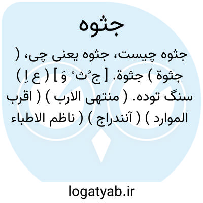 ( جثوة ) جثوة. [ ج ُث ْ وَ ] ( ع اِ ) سنگ توده. ( منتهی الارب ) ( اقرب الموارد ) ( آنندراج ) ( ناظم الاطباء ). پاره های سنگ فراهم آورده. ( مهذب الاسماء ). توده سنگ. توده خاک. ( ذیل اقرب الموارد ). سنگهای گردکرده. جَثوَة. جِثوَة. ( منتهی الارب ) ( اقرب الموارد ). ج، جِثی ̍، جُثی ̍. ( منتهی الارب ) ( اقرب الموارد ): صار فلان جثوة من تراب؛ اَی کوة منه. ( اساس، از اقرب الموارد ). || تن. ( منتهی الارب ) ( آنندراج ) ( ناظم الاطباء ). جسد. ( ذیل اقرب الموارد ). || خدرک آتش. ( منتهی الارب ) ( آنندراج ) ( ناظم الاطباء ). || قبر. گور. ( ذیل اقرب الموارد ). || کول گندم. ( مهذب الاسماء ).